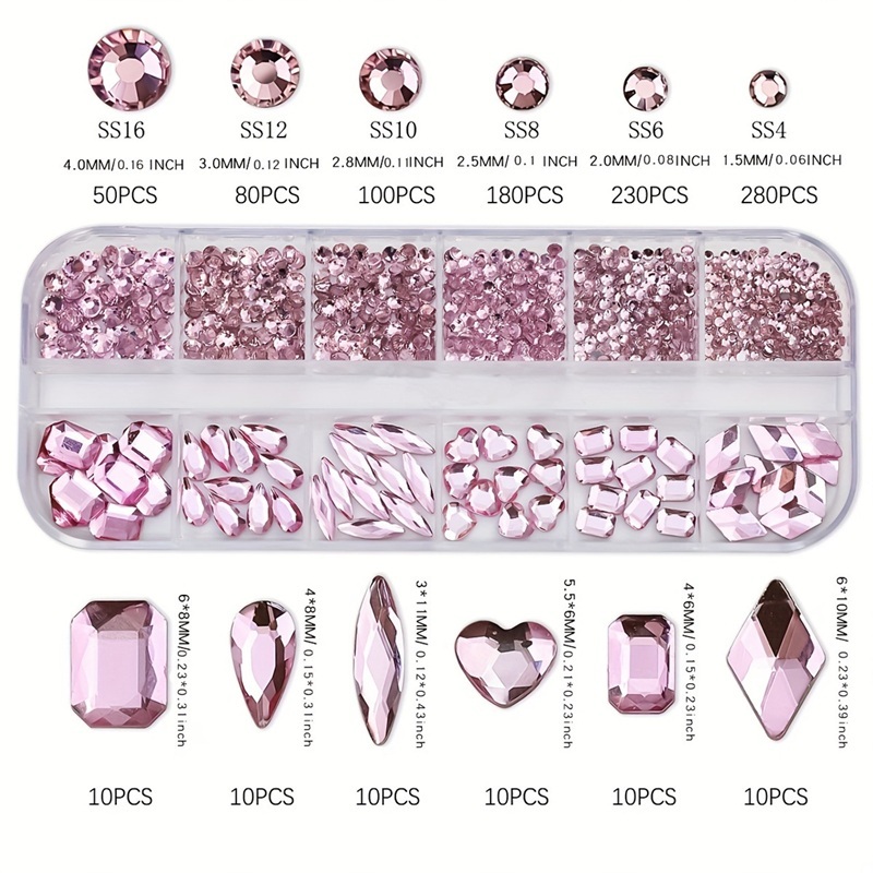 Σετ 12 θηκών με ροζ 3D strass σε πολλαπλά σχήματα για εντυπωσιακές nail art δημιουργίες. Κατάλληλο για gel, acrygel, ακρυλικό και press-on. Εξαιρετικά λαμπερά, ιδανικά για επαγγελματική ή προσωπική χρήση.