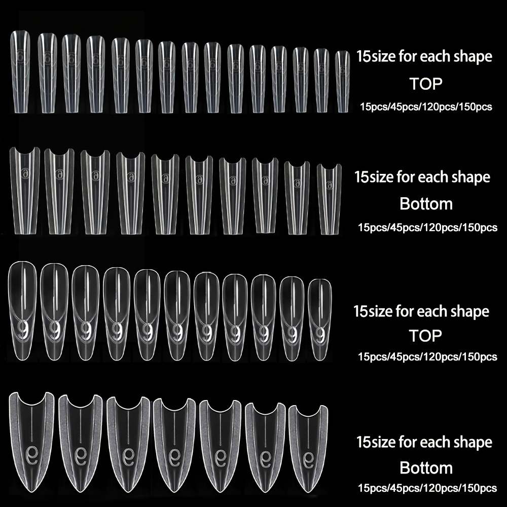 Το σετ περιλαμβάνει 15 μεγέθη (15 top + 15 bottom) για τέλεια εφαρμογή σε κάθε νύχι. Ο διάφανος σχεδιασμός βοηθά στον απόλυτο έλεγχο του υλικού για ομοιόμορφο και λείο αποτέλεσμα.