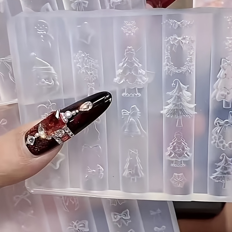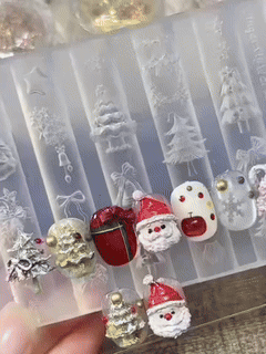Χριστουγεννιάτικο καλούπι σιλικόνης για δημιουργία 3D στολιδιών νυχιών, όπως Άγιος Βασίλης, δέντρα, γκι, φιόγκοι και γλυκάκια. Ιδανικό για nail art με gel, ακρυλικό ή ρητίνη, για επαγγελματίες αλλά και για αρχάριες που θέλουν γρήγορο, εντυπωσιακό γιορτινό αποτέλεσμα.