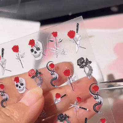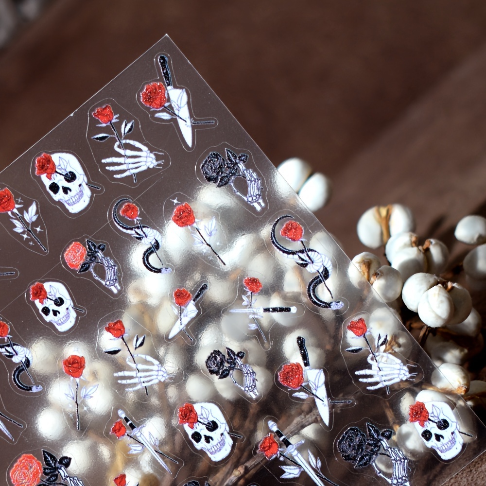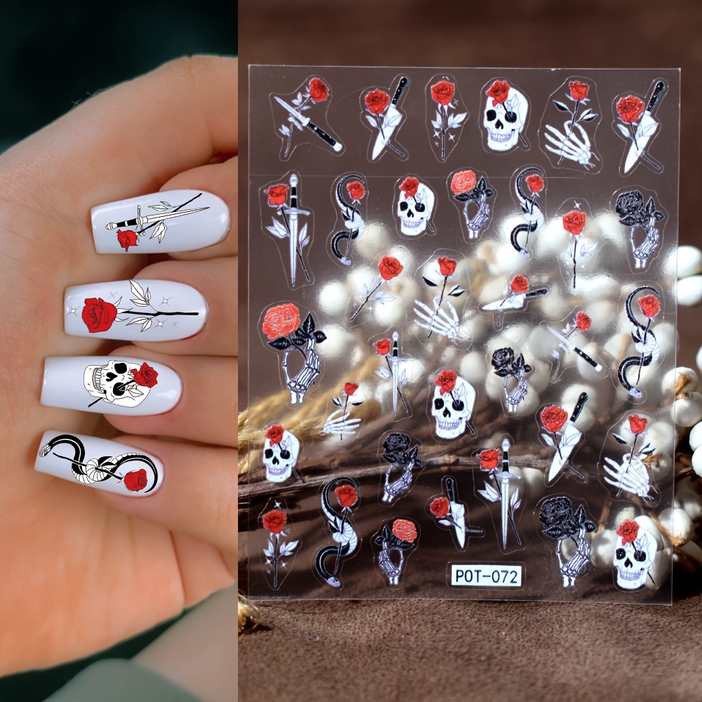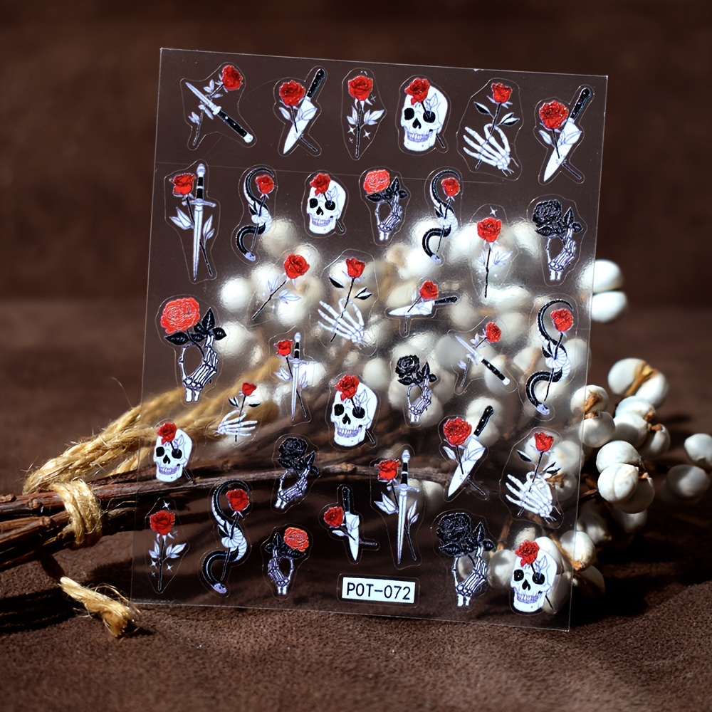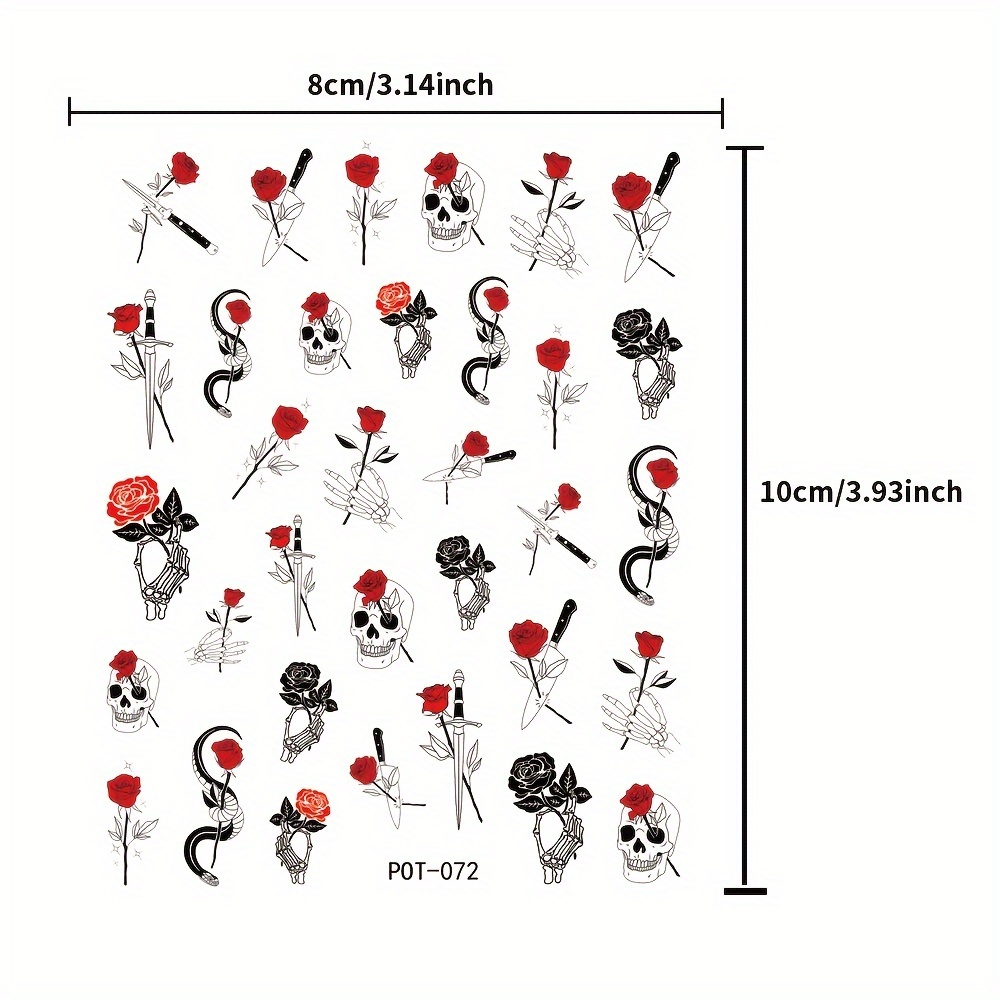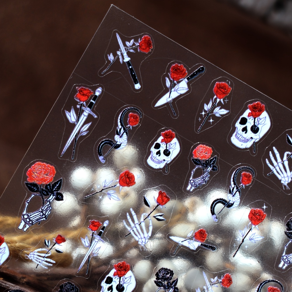 Αυτά τα εντυπωσιακά αυτοκόλλητα συνδυάζουν gothic skulls, κόκκινα τριαντάφυλλα, μαχαίρια και σκελετικά σχέδια για μοναδικό Halloween ή edgy nail look!